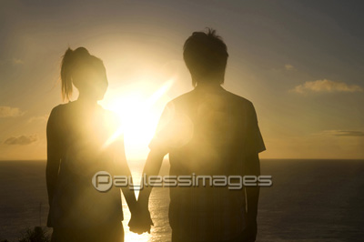 夕陽を背景に手をつなぎ立つ若い男女のシルエットの写真素材 Fyi ストックフォトのamanaimages Plus